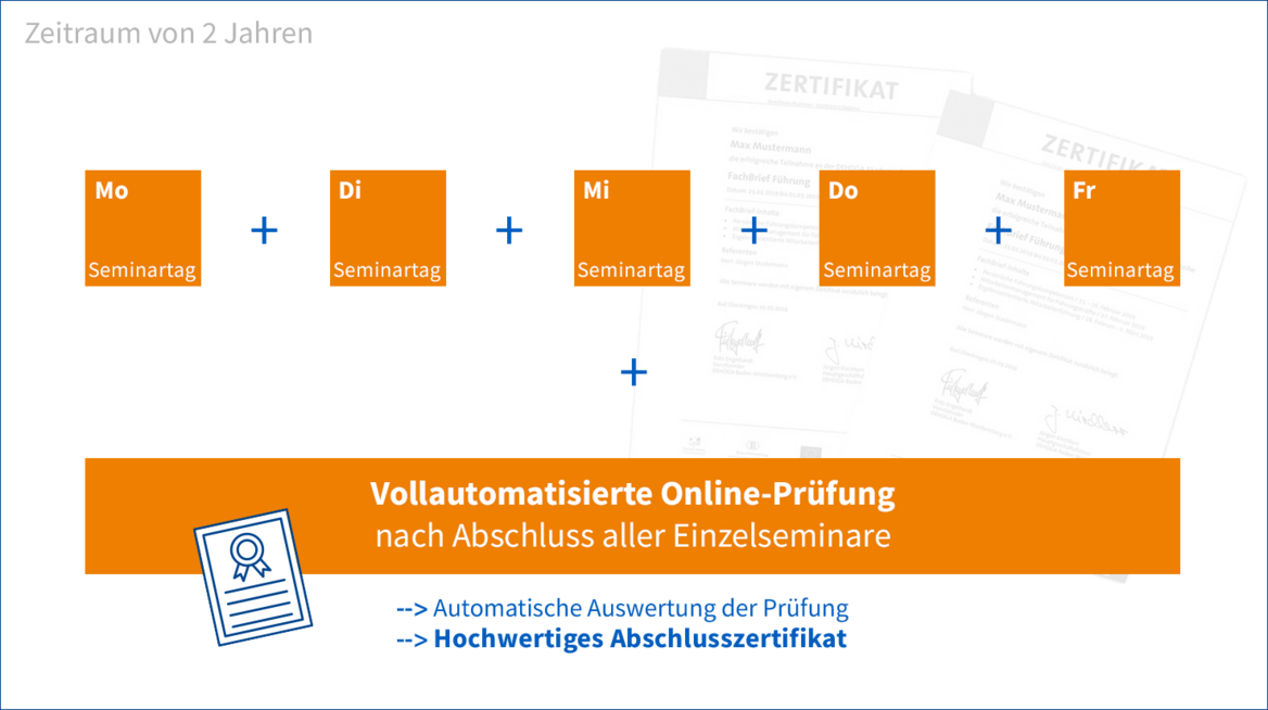 5 Seminartage zum Thema | Direkt im Anschluss Teilnahme an der Online-Prüfung möglich - unabhängig von Ort und Zeit | Sofortiger Erhalt des hochwertigen Abschlusszertifikats nach bestandener Prüfung