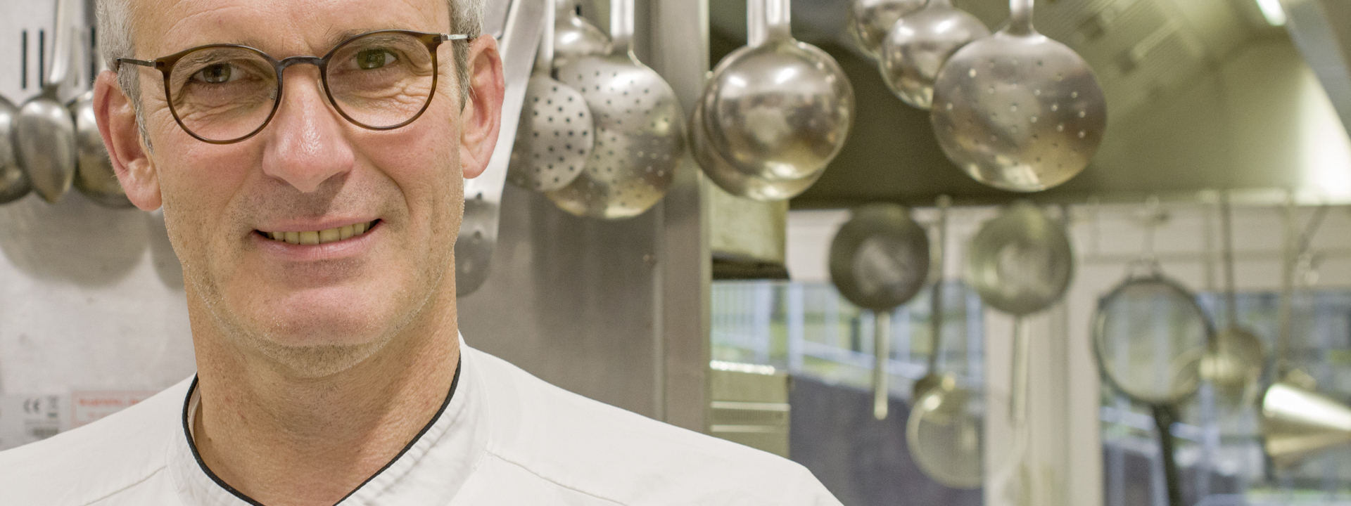 Close-Up: MAnn mit Brille in Kochjacke. Er steht in einer Küche